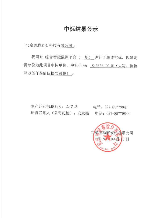 武漢市勘察設(shè)計(jì)有限公司綜合智能監(jiān)測平臺(tái)(一期)中標(biāo)結(jié)果公示