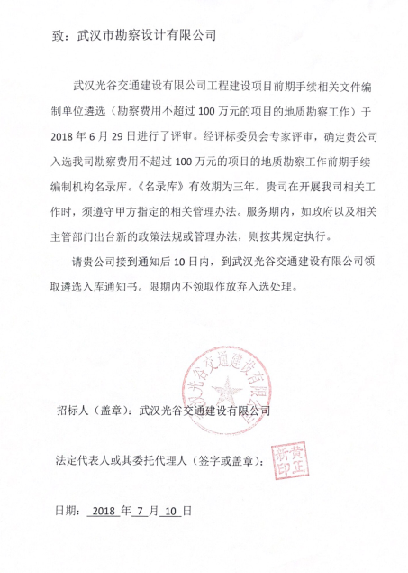 2018年6月29日,經投標,我公司成功入選武漢光谷交通建設有限公司勘察費用不超過100萬元的項目地質勘察工作,服務期限為三年。 武漢光谷交通建設有限公司主要業務范圍為城市地鐵、有軌電車、公交系統等公共交通項目的建設、運營管理;重大交通建設項目、重大...